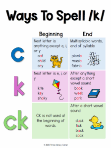 ? Grab my Phonics Rules Anchor Charts which includes a Ways to Spell /k/ chart that explains when to use the c, k, or ck spelling of /k/.